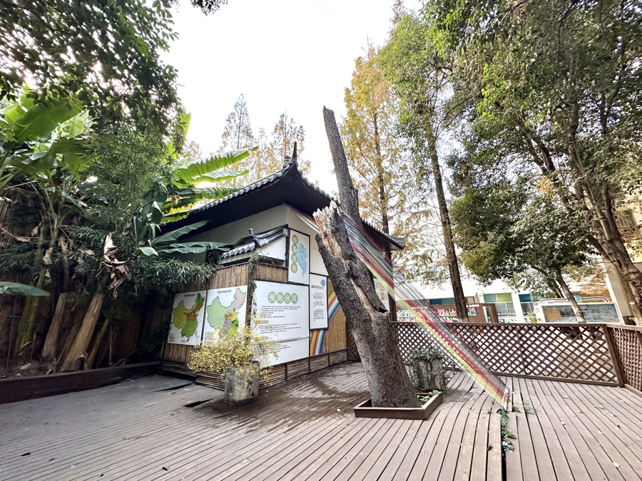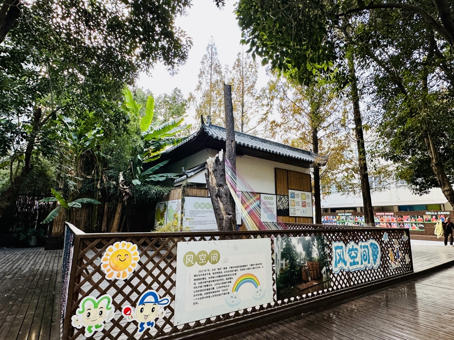 如今,5年过去了,“树坚强”成了校园中特别的景观。它被吹折的上半部枝杈,被做成了一个个小板凳;下半部分枝干仍“歪着脖子”,在一束绳索的牵引下稳稳站立。绳索有着彩虹的色泽,让人看到了生命的力量。经过美化,雪松背后的变电站摇身一变,通过科普展板和装置的设置,变成了气象科普“风空间”。孩子们可以尝试在画板上勾勒风的形状,也可转动“翻翻乐”做气象知识问答。墙上的小圆片舞动起来,风速大小一目了然。