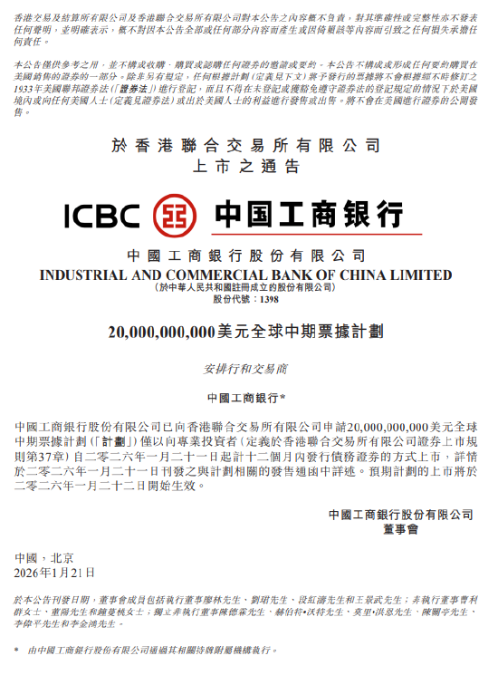 1月21日金融一线消息億策略,工商银行公告称,公司已向香港联合交易所有限公司申请200亿美元全球中期票据计划(“计划”)仅以向专业投资者自2026年1月21日起计十二个月内发行债务证券的方式上市。预期计划的上市将于2026年1月22日开始生效。